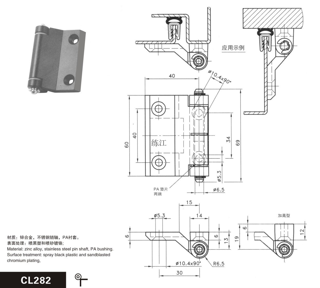 電柜鉸鏈CL282是上海練江電器制造有限公司主營產(chǎn)品之一,公司集科研,開發(fā),生產(chǎn),銷售于一體,具有完備的各類生產(chǎn)加工設(shè)備,專注生產(chǎn)高低壓開關(guān)柜附件,產(chǎn)品已通過ISO質(zhì)量管理體系認(rèn)證.了解詳情請(qǐng)聯(lián)系021-58811059.