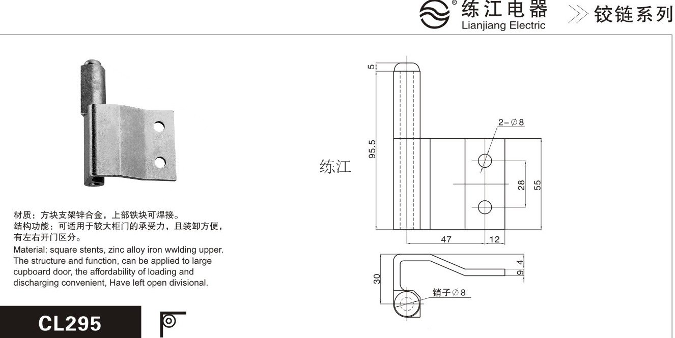 電柜鉸鏈CL295是上海練江電器制造有限公司主營產(chǎn)品之一,公司集科研,開發(fā),生產(chǎn),銷售于一體,具有完備的各類生產(chǎn)加工設備,專注生產(chǎn)高低壓開關柜附件,產(chǎn)品已通過ISO質(zhì)量管理體系認證.了解詳情請聯(lián)系021-58811059.
